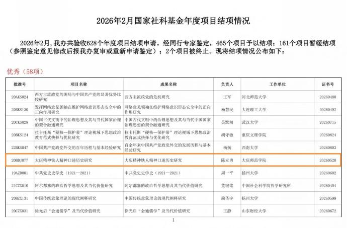 近日,全国哲学社会科学工作办公室公布了2026年2月国家社科基金年度项目结项情况,我校大庆精神研究基地主任陈立勇教授主持的国家社科基金一般项目“大庆精神铁人精神口述历史研究”(项目批准号:20BDJ077),经全国哲学社会科学工作办公室审核批准正式结项,鉴定等级为“优秀”。