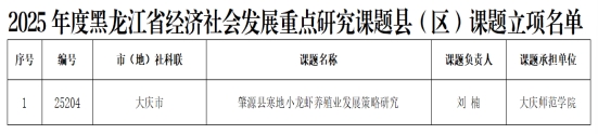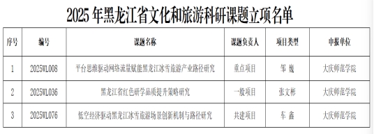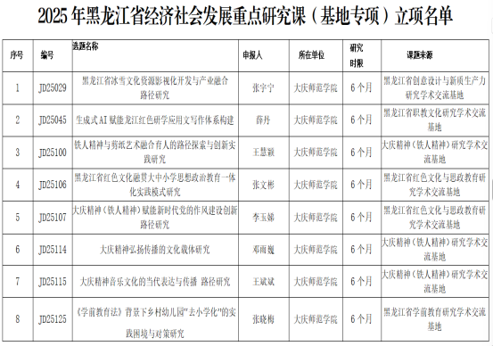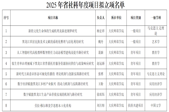 近日,黑龙江省多项省级人文社科类课题立项名单陆续公布,包括《2025年黑龙江省社科研究规划项目拟立项名单》《2025年黑龙江省艺术科学规划项目立项名单》《2025年黑龙江省文化和旅游科研课题立项名单》,以及黑龙江省社会科学界联合会发布的《2025年黑龙江省经济社会发展重点研究课题县(区)立项公告》《2025年黑龙江省经济社会发展重点研究课题(外语专项)立项公告》《2025年黑龙江省经济社会发展重点研究课题(基地专项)立项公告》。