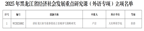 以上成绩得益于学校长期以来对科研工作的高度重视与持续投入,也凝聚着广大教师的智慧与汗水。未来,学校将继续优化科研管理机制,搭建高水平研究平台,为项目开展提供全流程支持。希望各课题负责人以此为契机,潜心钻研、扎实推进,力争将研究成果切实转化为推动龙江产业升级、文化繁荣与社会发展的实际成效,为黑龙江省高质量发展注入更多高校智慧与力量。(撰稿:张彪 审核:张晓梅 编辑:于冰)
